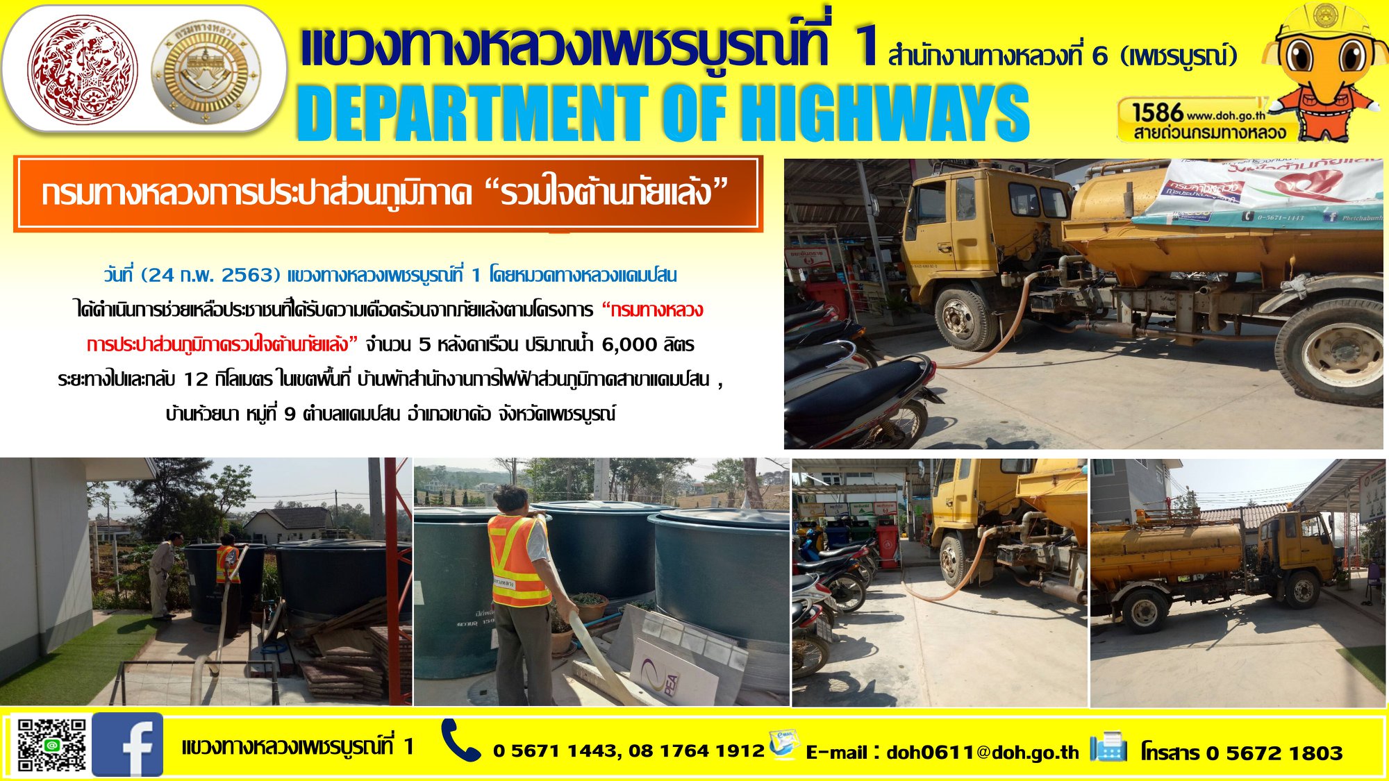 วันที่ (24 ก.พ. 2563) แขวงทางหลวงเพชรบูรณ์ที่ 1 โดยหมวดทางหลวงแคมป์สนได้ดำเนินการช่วยเหลือประชาชนที่ได้รับความเดือดร้อนจากภัยแล้งตามโครงการ “กรมทางหลวง การประปาส่วนภูมิภาครวมใจต้านภัยแล้ง” จำนวน 5 หลังคาเรือน ปริมาณน้ำ 6,000 ลิตร ระยะทางไปและกลับ 12 กิโลเมตร ในเขตพื้นที่ บ้านพักสำนักงานการไฟฟ้าส่วนภูมิภาคสาขาแคมป์สน , บ้านห้วยนา หมู่ที่ 9 ตำบลแคมป์สน อำเภอเขาค้อ จังหวัดเพชรบูรณ์
