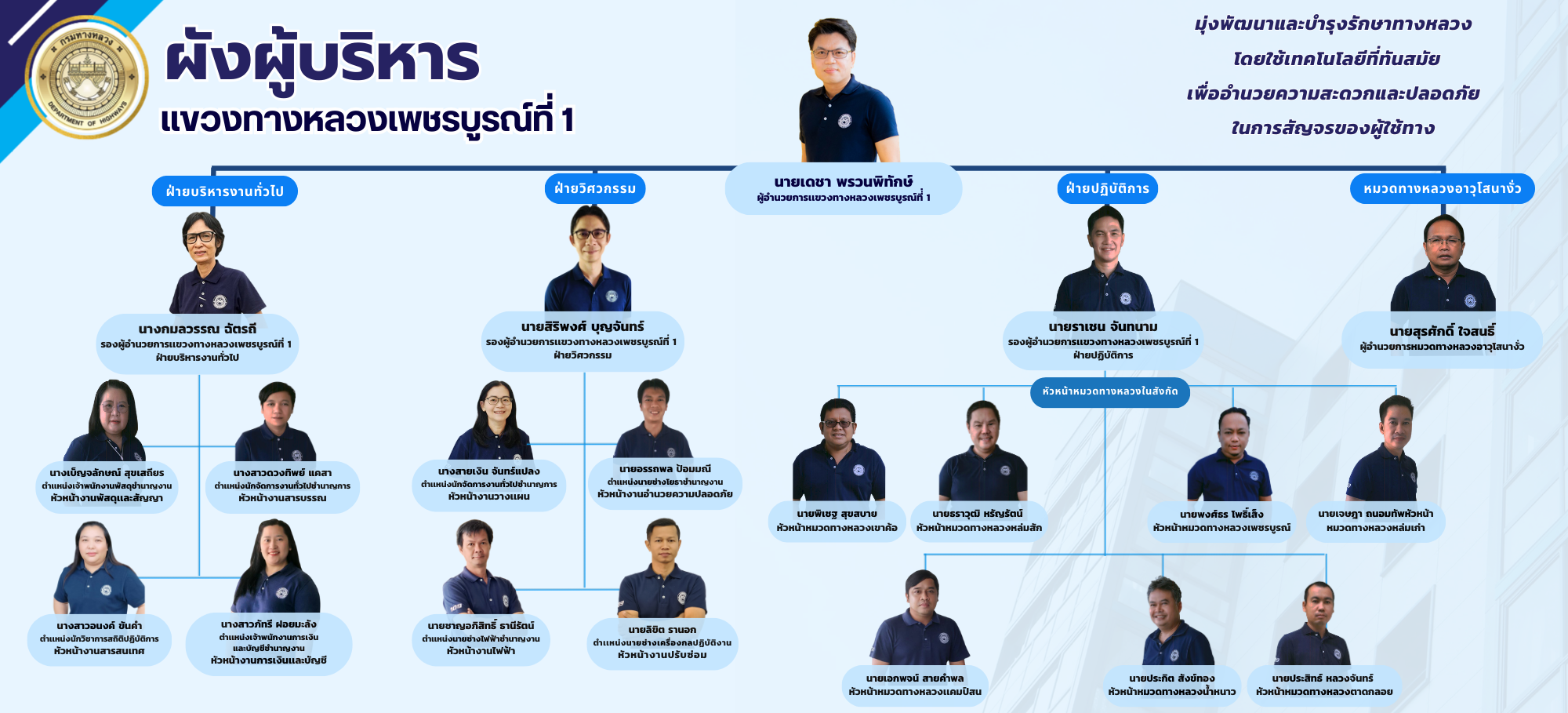 วิสัยทัศน์ : มุ่งพัฒนาและบำรุงรักษาทางหลวง โดยใช้เทคโนโลยีที่ทันสมัย เพื่ออำนวยความสะดวกและปลอดภัย ในการสัญจรของผู้ใช้ทาง